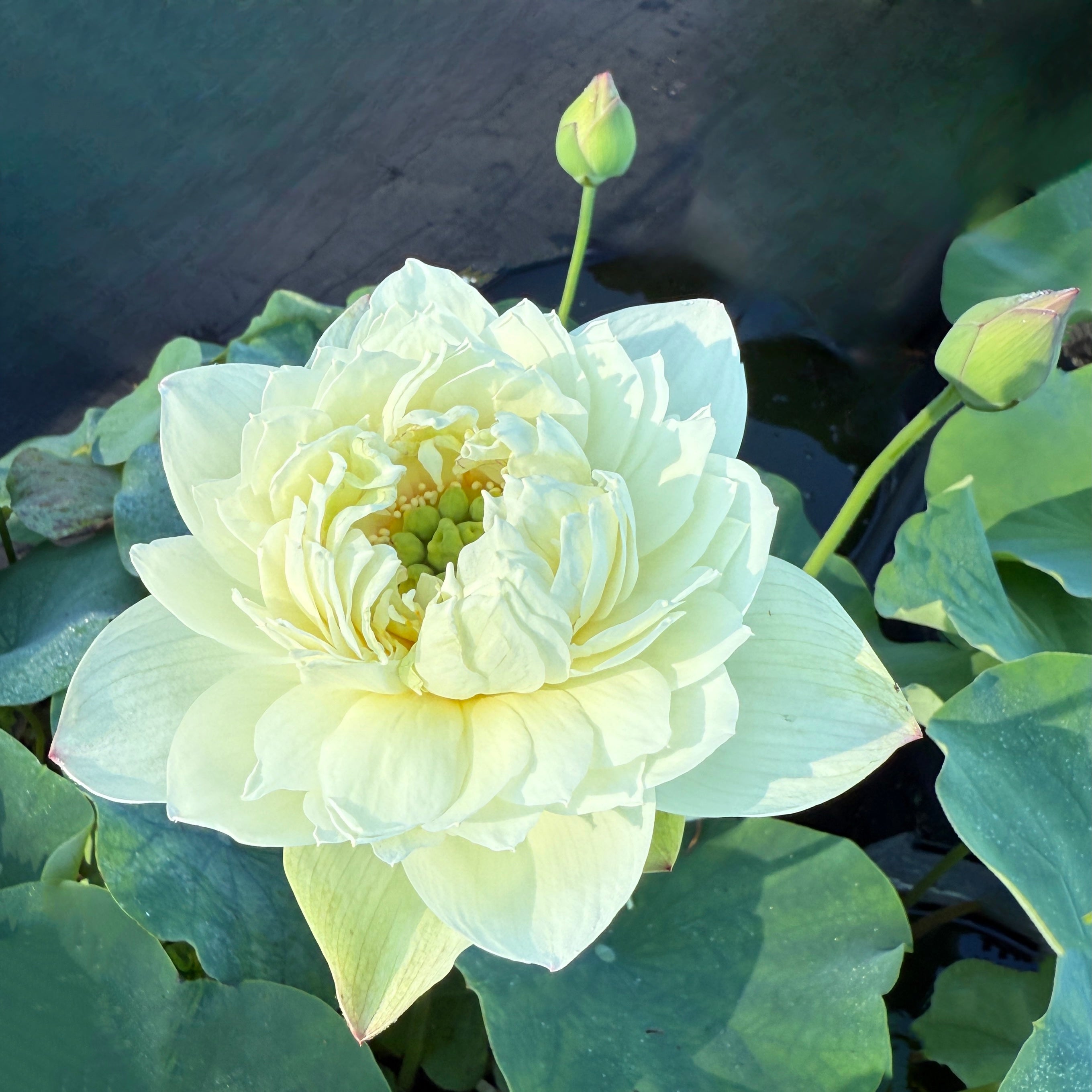 This tiny little lotus is perfect for a very small pot! A lovely extra-light yellow lotus whose petals drape downward when fully open, 'White Pear Flower' has a prominent green receptacle or yellow-green petaloids. This lotus wins the award for having the strangest rhizomes. The internodes of the rhizomes are round like bubblegum balls linked together. 'White Pear Flower' prefers shallow water and small pots. It is one of the first varieties to bloom in the spring.