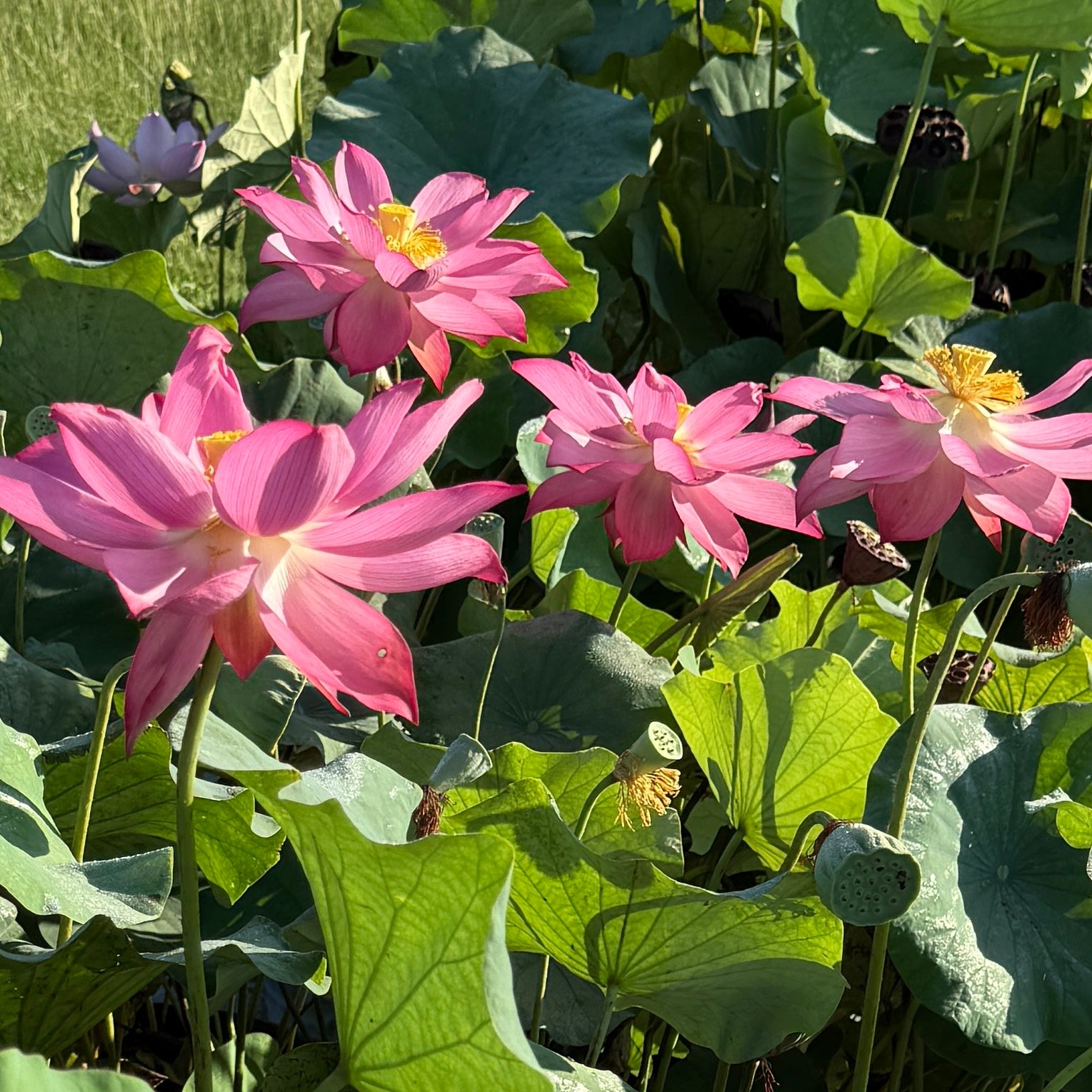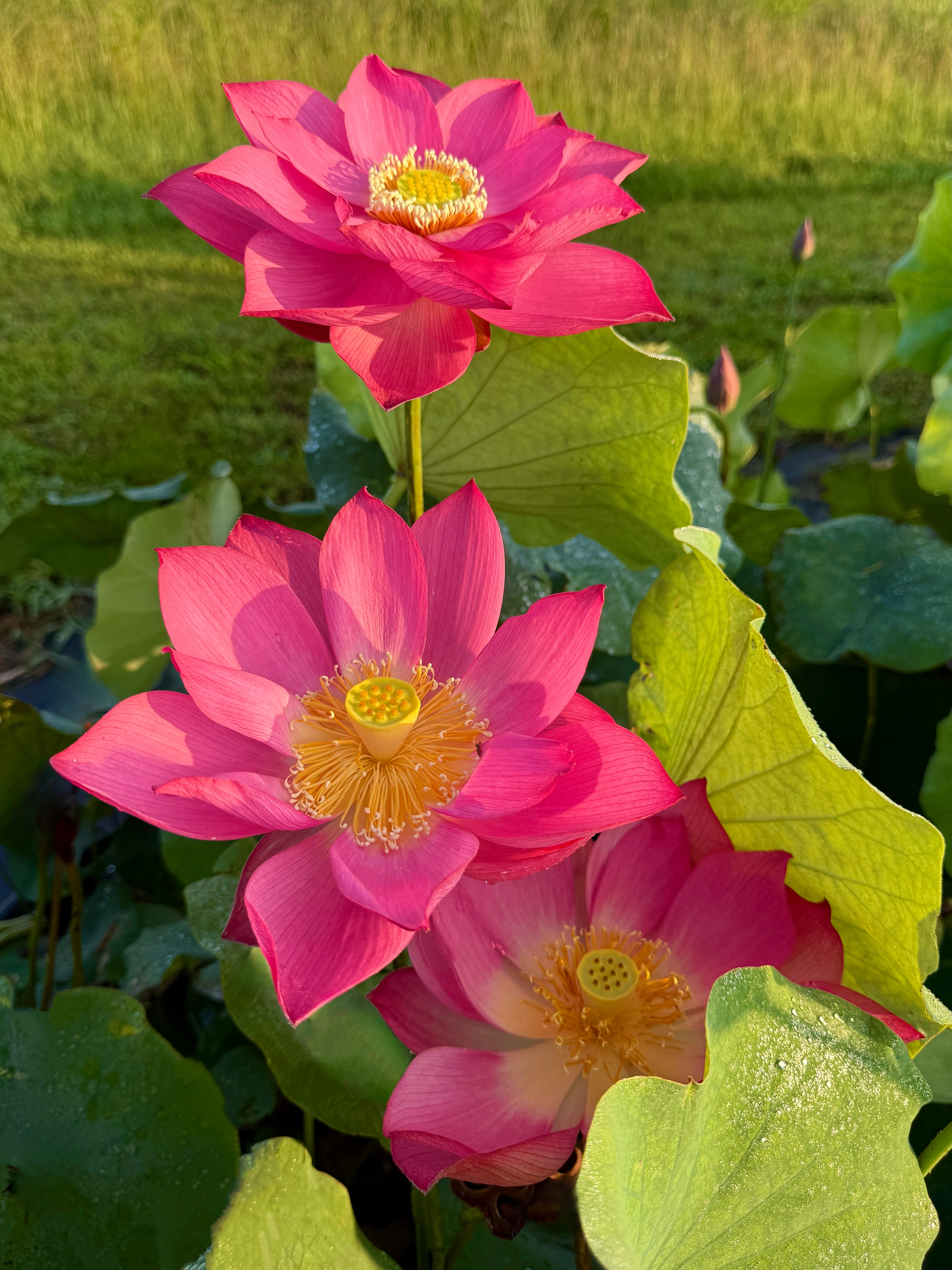 This lotus always makes you stop for a second look. Majestic, rich, deep pink flowers tower above the leaves. 'East Lake Pink' produces large seed pods suitable for using in floral arrangements. At the nursery 'East Lake Pink' usually grows to be a tall lotus (more than 48" tall) but it will sometimes stay a few inches shorter.