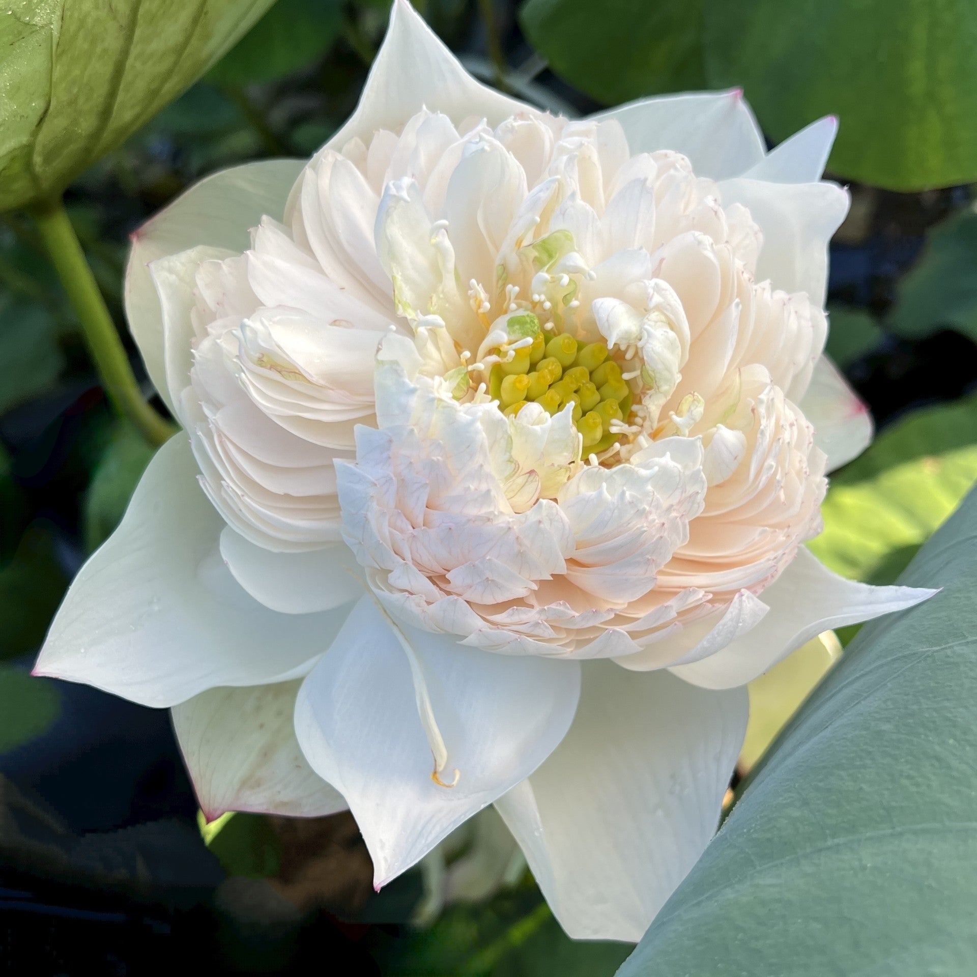 The very large rounded outer layer of petals hold a big ball of petals that look like snow on a mountain peak. This new lotus blooms often and the flowers are long-lasting. One of our favorite new varieties, it is a protected cultivar hybridized by Yileen Water Gardens in Nanjing. Grows very well for us here at the nursery.