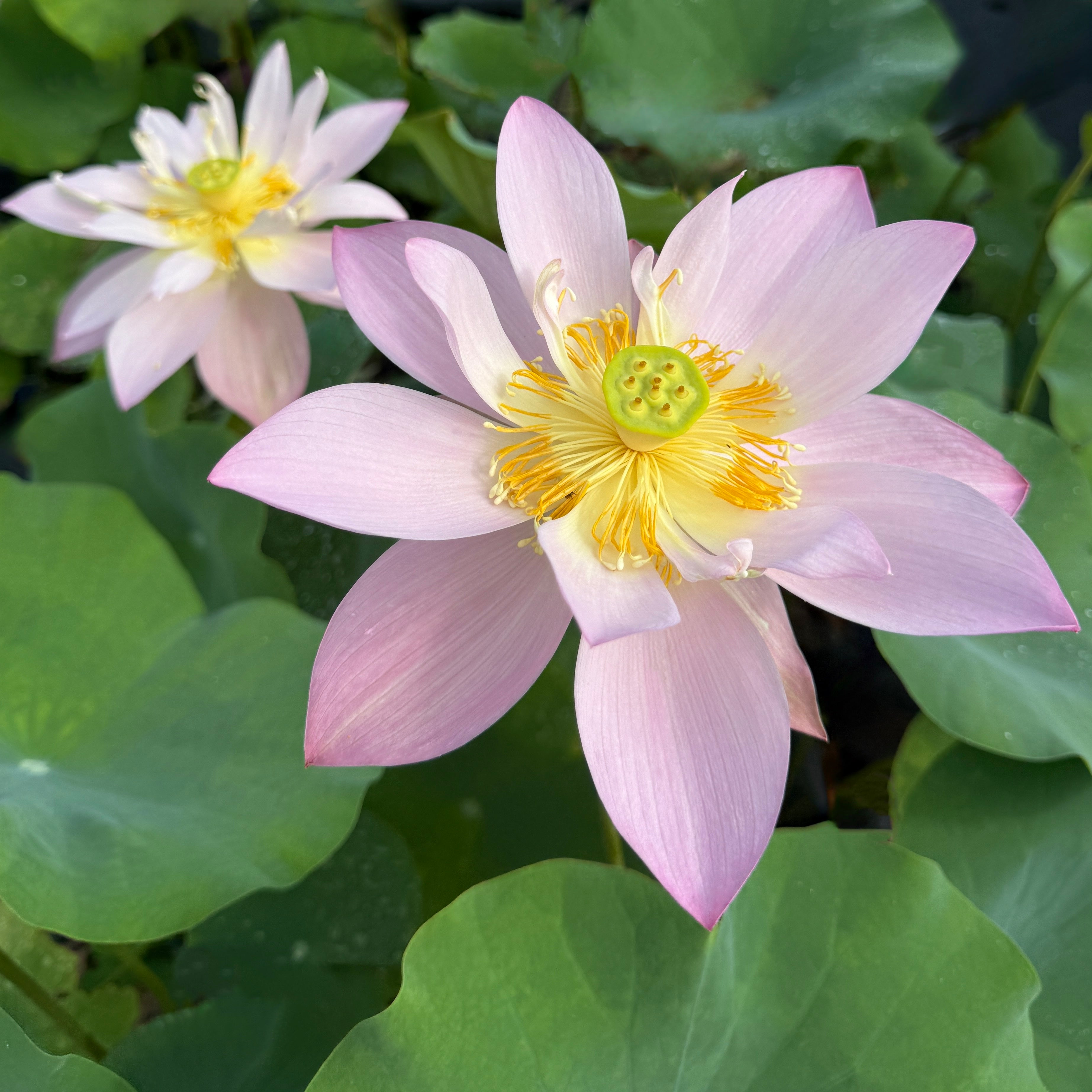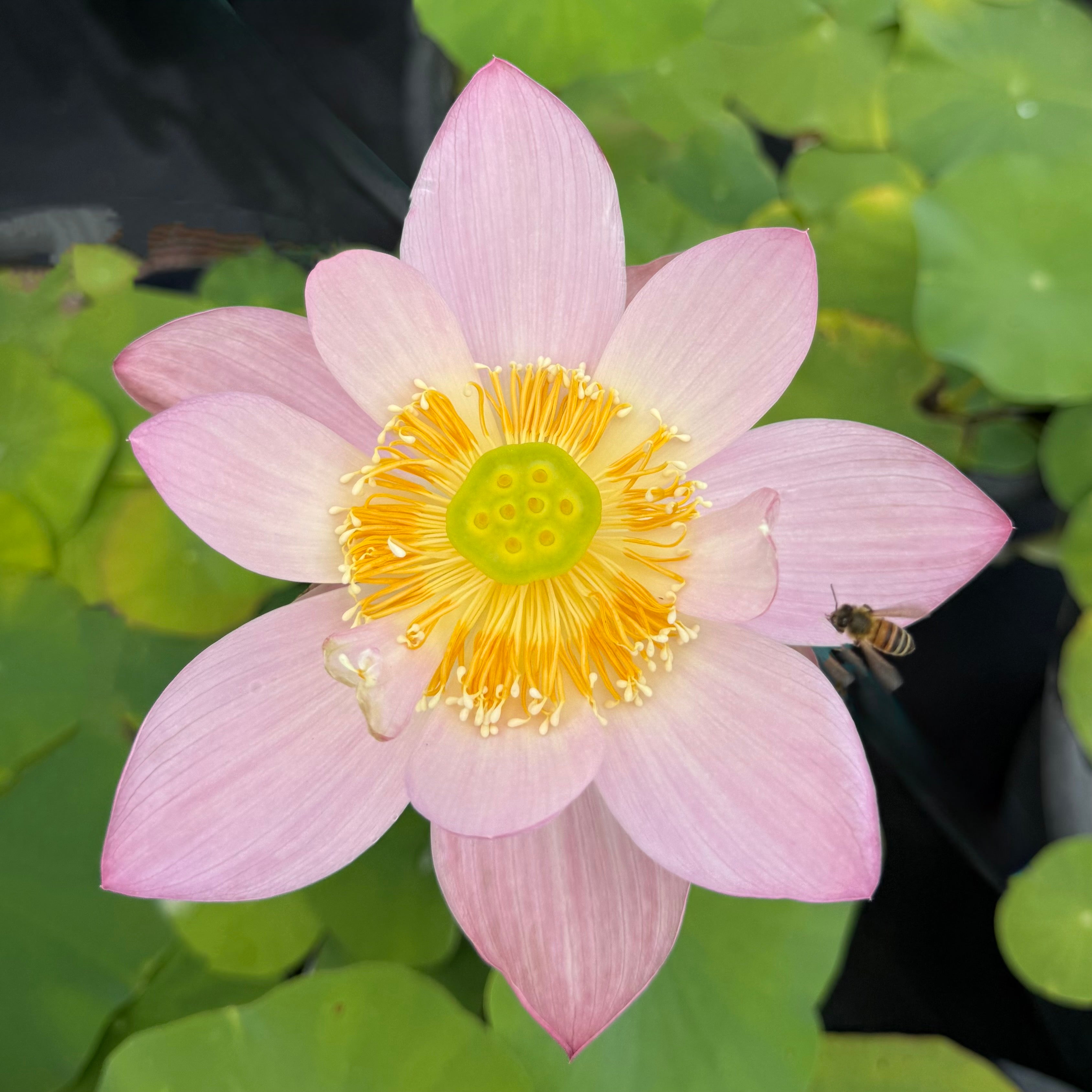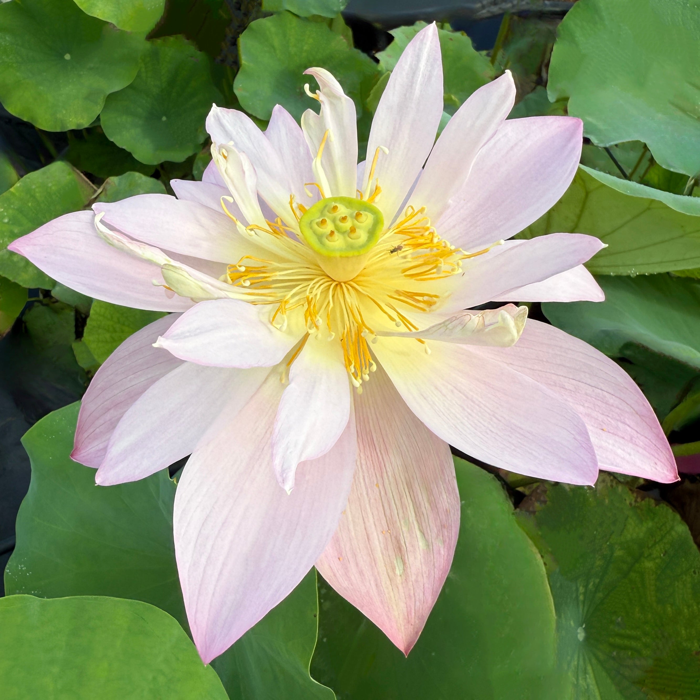 A whisper of pink on a flying, dancing flower. The outer petals are long and full while the inner circle of flowers is varied in size with a nice curve toward the lime green receptacle. The picture above is used courtesy of Yileen Water Gardens who are the hybridizers of this variety but the rest were made at Ten Mile Creek. We particularly like the orange ruff of stamen that makes this flower so unique.